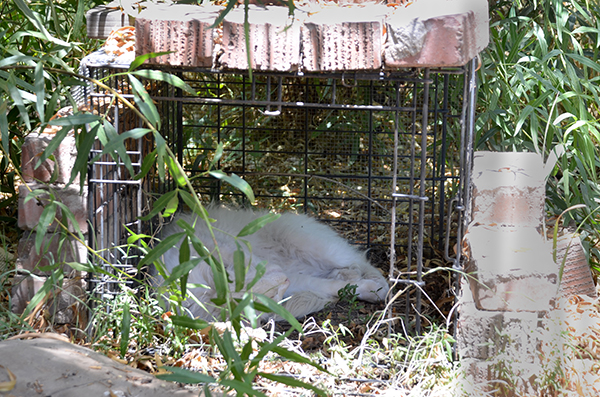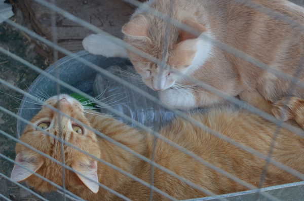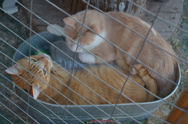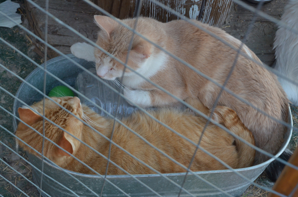 The Chat-i-eau Crew and their Ice Blocks (Cinnamon and Cocoa share just about EVERYTHING!) The Chat-i-eau is a 16'x16' enclosure. Half of it is about ten feet tall, and covered by an aluminum roof extension from the patio under which I sit. The north half drops to about six fee high and is covered with shade cloth. That half, unfortunately gets wet in the rain. There are seven residents, all of whom have pretty much been in there since being kittens, and are, I would estimate, at least three. The ground is covered with fake/plastic grass matting from Home Depot . They have four litterboxes, three 'carry kennels', an 'overstuffed' chair, a couple bales of straw, and a carport-sale $1200 Tiny Tykes play set, that I picked up for $240, in which I they have a 'ball pit'. I never see anyone in the pit, but I am forever collecting balls and returning them! I refer to it as a 'Chat-i-eau' as i am sure it is a 'castle' compared to the parking lots and alleys they came from. The Tiny Tyke unit, I refer to as 'The Cat-stle'. There are also a few pics of part of the Cas-stle on: http://shadowcats3.com/i_cat-pture_cats.html They also have four oblong galvanized tubs like the one shown in these pics, with pads for liners.