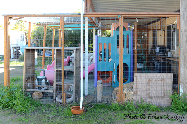 The enclosure is 16'x16', with a 'catwalk' where the aluminum ceiling ends, about half way in, that goes around the inner half. The 'floor' in 'plastic grass' from a Big Box 'Home Improvement' store.